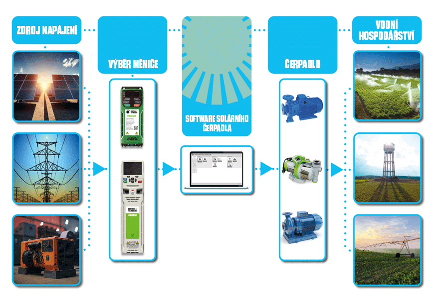 Aplikace zahrnující čerpání vody v odlehlých oblastech, kde je k dispozici nespolehlivý nebo žádný zdroj elektřiny, potřebují řešení, které zajistí spolehlivost, účinnost a sníží energetické nároky. Využití solární energie znamená, že čerpací systém lze instalovat téměř kdekoli, bez ohledu na dostupnost energetické infrastruktury a související náklady. Využití přirozené sluneční energie je nejefektivnějším způsobem, jak překonat problémy s dopravou vody tam, kde má být a kdy tam má být.