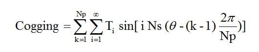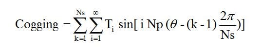 which is the amplitude of the cogging, at the frequency of Ns times the mechanical speed, that is to say the teeth frequency. This value can be very large, since T1 is the largest component in the single magnet torque waveform.