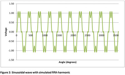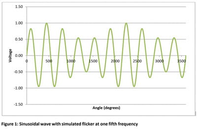 Figure 1 shows an exaggerated waveshape with simulated flicker at one fifth the supply frequency. By contrast Figure 2 shows a simulated fifth harmonic. In Figure 2 every cycle is distorted but the same shape, so no flicker occurs.