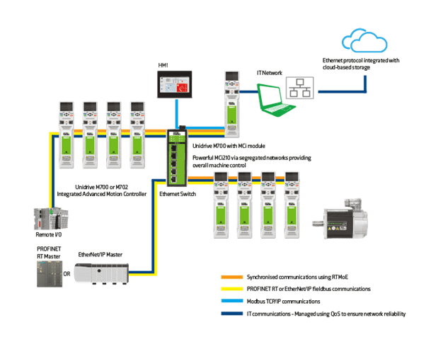 The diagram below gives an illustration of the flexibility that Unidrive can bring, exploiting the high performance, cost effective features of RTMoE simultaneously with the supervisory control offered by a traditional PLC.