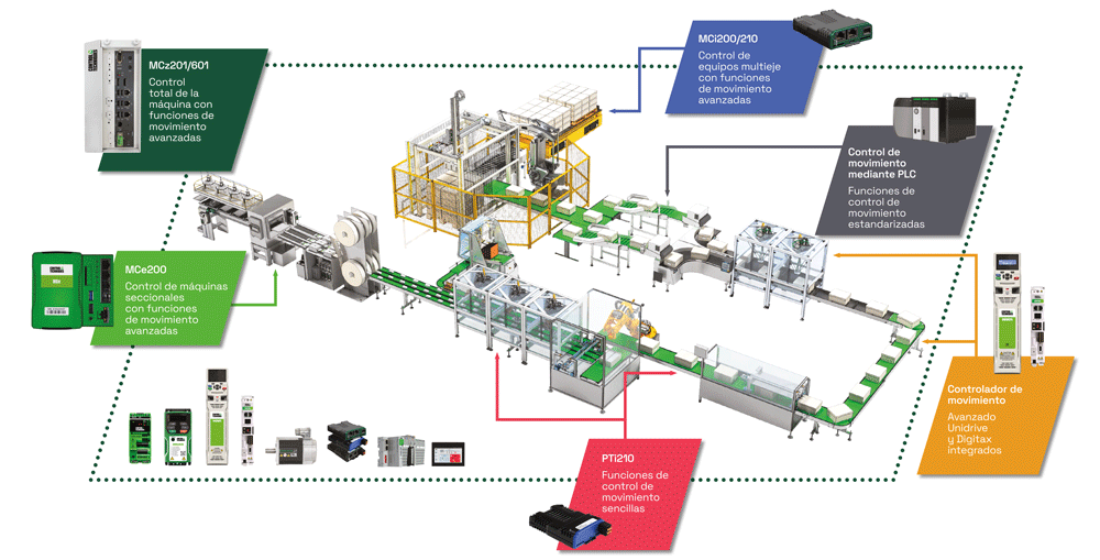 Nuestros productos de control de movimiento aportan muchas ventajas a sus máquinas y pueden funcionar en aplicaciones independientes o juntos en una línea de producción completa.