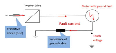 Normally the VSD limits the ground fault current to much lower levels and shorter durations than a fuse or circuit breaker. However it relies on complex semiconductor devices and circuits to achieve this, which might fail. For safety reasons therefore the ground loop impedance for the ground connection needs to be the same as if there were no VSD – ultimate protection is provided by the upstream protection device feeding the drive. The choice of ground conductor dimension is exactly the same as for a directly fed motor.