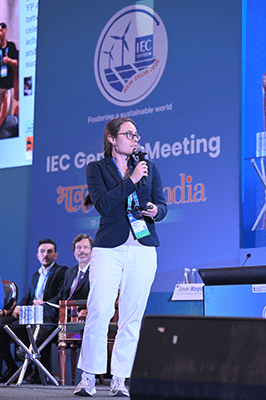 "Sono incredibilmente grata di essere stata selezionata per rappresentare il Regno Unito all'Assemblea Generale dell'IEC. Ho avuto l'opportunità di approfondire i processi alla base dello sviluppo degli standard e di conoscere la valutazione della conformità. Parlare davanti all'Assemblea Generale e fare networking con professionisti provenienti da 96 paesi è stata un'esperienza indimenticabile.